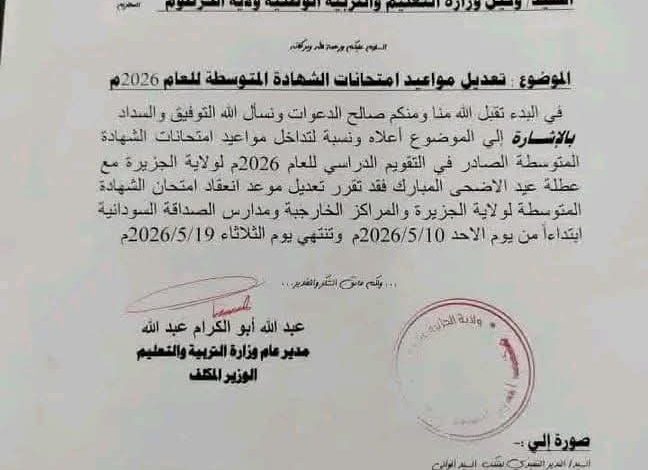 قررت وزارة التربية والتعليم تقديم موعد امتحانات الشهادة المتوسطة بعد تعارض موعدها الاول مع ايام عيد الأضحى لتحرىخلال الفترة من يوم ١٠ مايو حتى ١٩ مايو