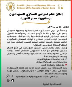 دعت سفارة السودان بجمهورية مصر العربية جميع السودانيين من مرضى السكري الموجودين في مصر لتسجيل بياناتهم عبر الرابط الإلكتروني المخصص لتقديم خدمات الرعاية الصحية بالتنسيق مع الاتحاد الدولي والاتحاد السوداني للسكري عبر إطلاق مبادرة لحصر المرضى توطئة لتقديم الخدمات الصحية اللازمة .