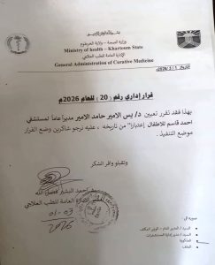 صدر قرار الأحد بتعيين إختصاصي الأطفال الدكتور يسن الأمير حامد مديرا عاما لمستشفى أحمد قاسم التخصصي للاطفال.