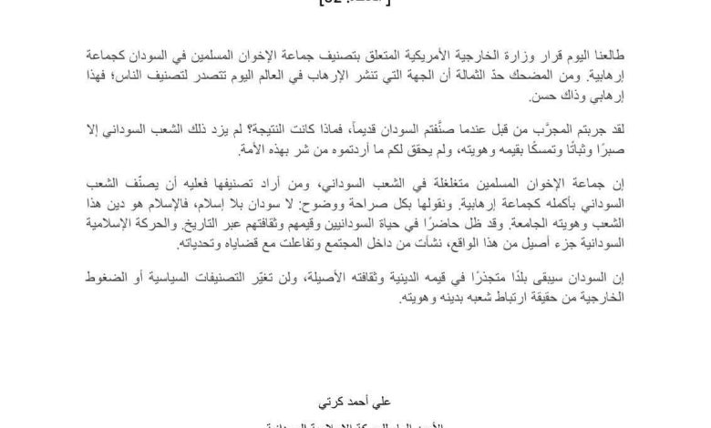 أصدرت الحركة الإسلامية في السودان بيانا الإثنين ردت فيه على قرار وزارة الخارجية الأميركية بتصنيف جماعة الإخوان المسلمين في السودان منظمة إرهابية .