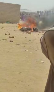 وبعد أن تم إلقاء القبض على الجناة قام الشباب بإحراق الدراجة النارية التي كانت تستغلها العصابة  .