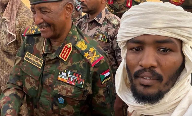 لقطات توثق لحظة استقبال رئيس مجلس السيادة الانتقالي في السودان عبد الفتاح البرهان للقائد المنشق عن مليشيا قوات الدعم السريع اللواء النور القُبة  .