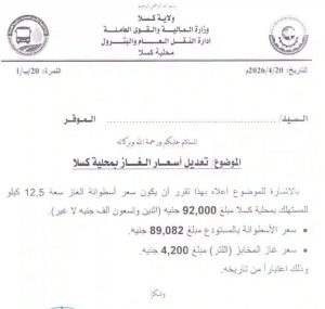 مواصلة لنهج وزارات المالية بتحديد أسعار للمحروقات في أوقات متقاربة فقد أعلنت إدارة النقل والبترول بولاية كسلا عن تحديد مبلغ 92 الف جنيه لتعبئة أسطوانة الغاز زنة 12.5 كيلو وهو أعلى سعر منذ عقود .