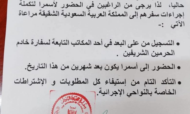 نوهت  السفارة السودانية بأسمرا الي أنه تتم حاليا تحديثات تأشيرات العمل (فيزا الإقامة) جهة التفويض أسمرا ونسبة لتوقف البصمة البيومترية في السفارة السعودية بأرتريا لقرابة أسبوعين وحتى اليوم . فعلى الراغبين في تكملة الإجراءات التسجيل لدى أي سفارة للمملكة من على البعد  على أن يكون الحضور لأسمرا بعد شهرين من تاريخه .
