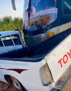 ‏إصطدم الأربعاء بص سياحي مع  سيارة ملاكي ( بوكس ) بالطريق القومي عطبرة أبوحمد لكن عناية الله أنقذت الطرفين حيث لم تنتج عن الحادث إصابات خطيرة وسط الركاب  .