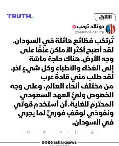 قال الرئيس الأميركي دونالد ترمب على “تروث سوشال”: الأربعاء :ترتكب فظائع هائلة في السودان، لقد طلب مني ولي العهد السعودي أن أستخدم نفوذي لوقف الحرب الدائرة هناك، وسنعمل مع المملكة ودول أخرى لإنهاء هذه المأساة .