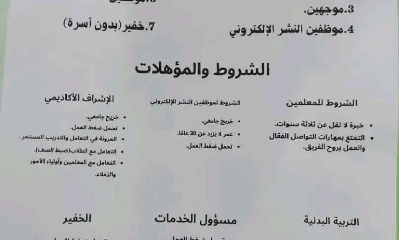 أعلنت إدارة مدارس الكودة بالسودان عن وظائف شاغرة للمعلمين بجميع المراحل علاوة على وظائف مشرفين وموجهين وموظفين في مجالات مختلفة وفق الإعلان أدناه :