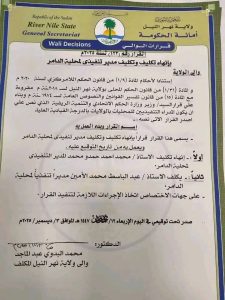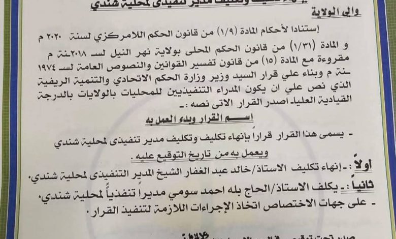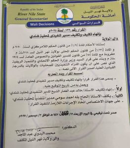 أصدر والي ولاية نهر النيل محمد البدوي عبد الماجد الأربعاء قرارا قضى بإقالة المدير التفيذي لمحلية شندي خالد عبدالغفار الشيخ وتكليف الحاج بلة أحمد سومي عوضا عنه .