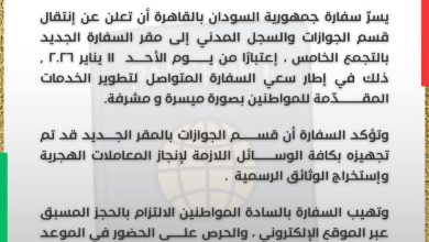 القاهرة : ون كليك نيوز أعلنت السفارة السودانية في القاهرة أن قسم الجوازات سينتقل الي مقرها الجديد بالتجمع…